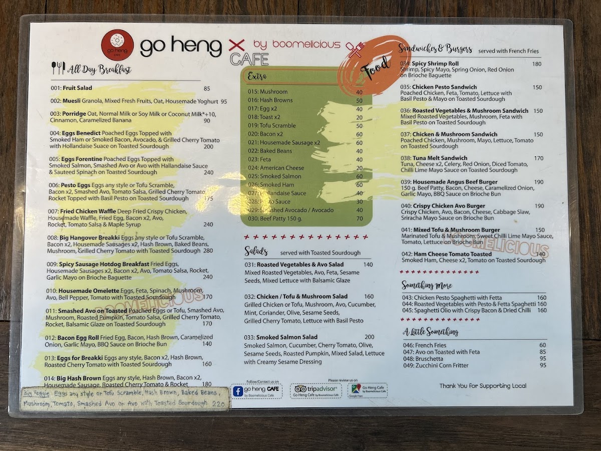 Introducing the menu at Go Heng Cafe by Boomelicious Cafe, a hidden gem located in the scenic Mae Hong Son province of Thailand. This charming cafe has captured the hearts (and taste buds) of locals and travelers alike with its delightful breakfast offerings.